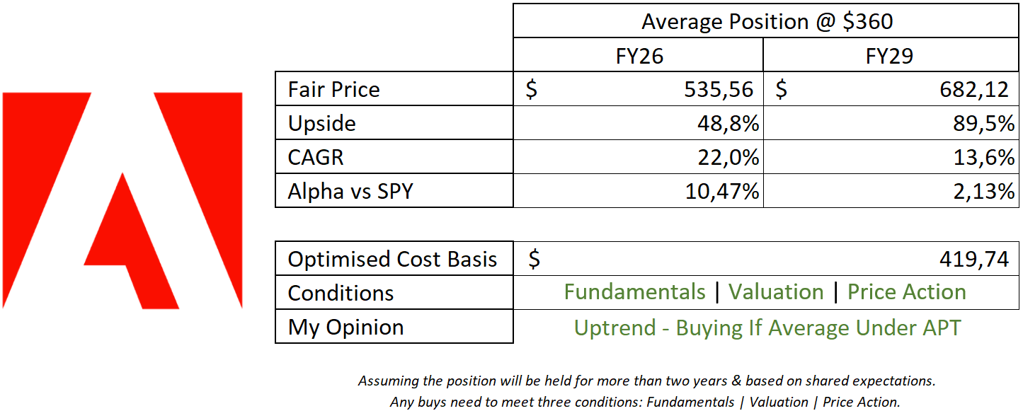 This model seems fair, not conservative nor bullish, simply fair, in all metrics assuming that Adobe is part of the AI revolution and deserves AI softwares multiples.