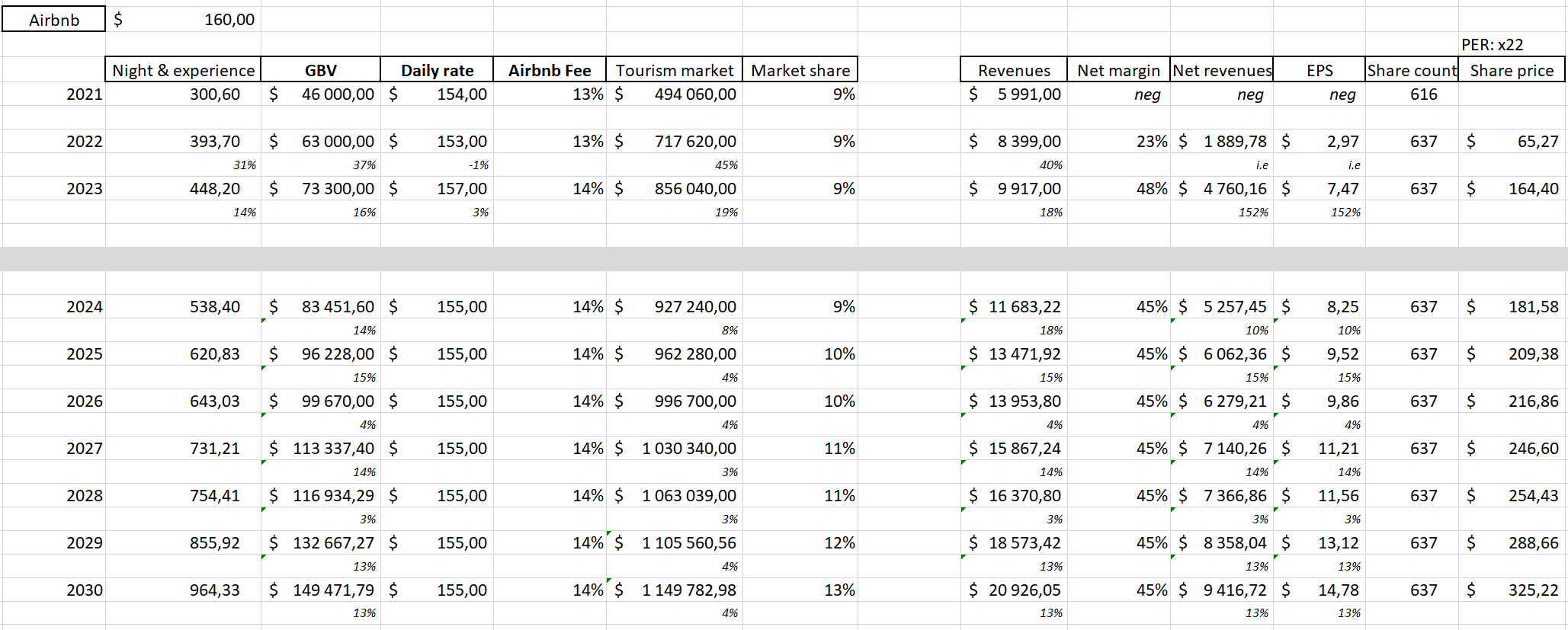 Knowing the total market, Airbnb's market share & platform fees allow me to compute the company's revenues, net income considering a 45% net margin - which is what Airbnb does today so nothing crazy as to assume it'll stay flat in the future - and therefore EPS assuming that share count stays flat. With those assumptions, we would see a CAGR around 12% for the company, way lower than the 30% of the last three years but reasonable considering its potential & future services.