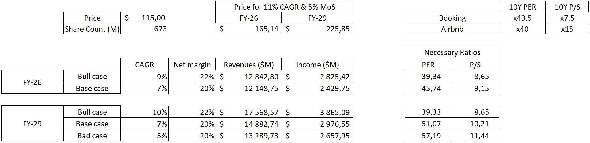 All assumptions are based on the company's market shares which I intentionally grew over the years as Airbnb is expanding to more countries aggressively, its network effect is growing and they will very probably have released more services by then, possibly owning 13% of the entire market by 2030. Achievable knowing that Bookings' FY-23 GBV sits at more than $100B today.
