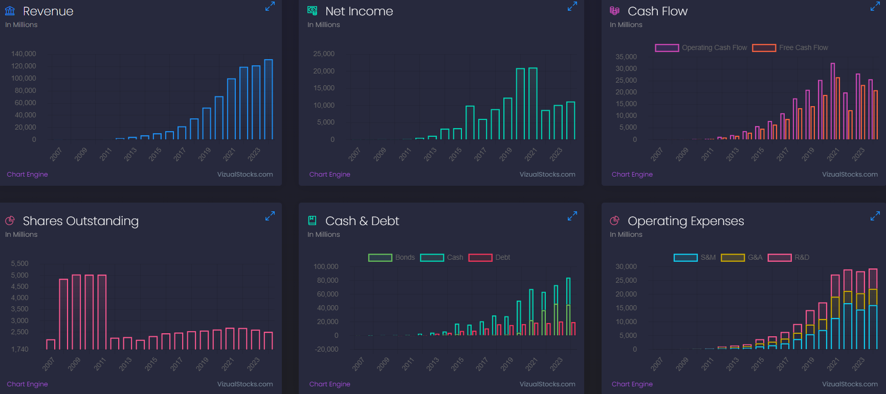 It allowed the company to do things a bit differently while still growing with an astonishing 33% CAGR over the last 10 years. Being profitable helped them grow a very strong balance sheet with a $56B net debt and to bring back value to shareholders through both dividends & shares buybacks.