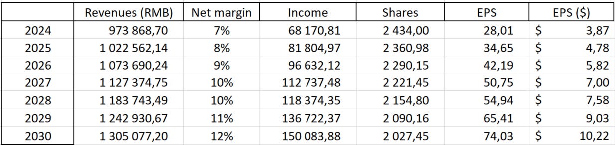 This is a pretty simple view on what Alibaba would become with a 5% CAGR, increasing net margins while shares outstanding decrease 3% per year - not hard to do with such massive buyback programs. Besides the net margins growth, assumptions are bearish.