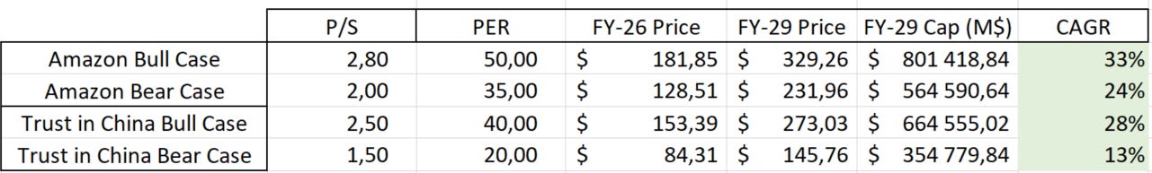As a reminder, Amazon is actually trading with P/S & PER respectively at x2.8 & x50. The table reviews different cases.