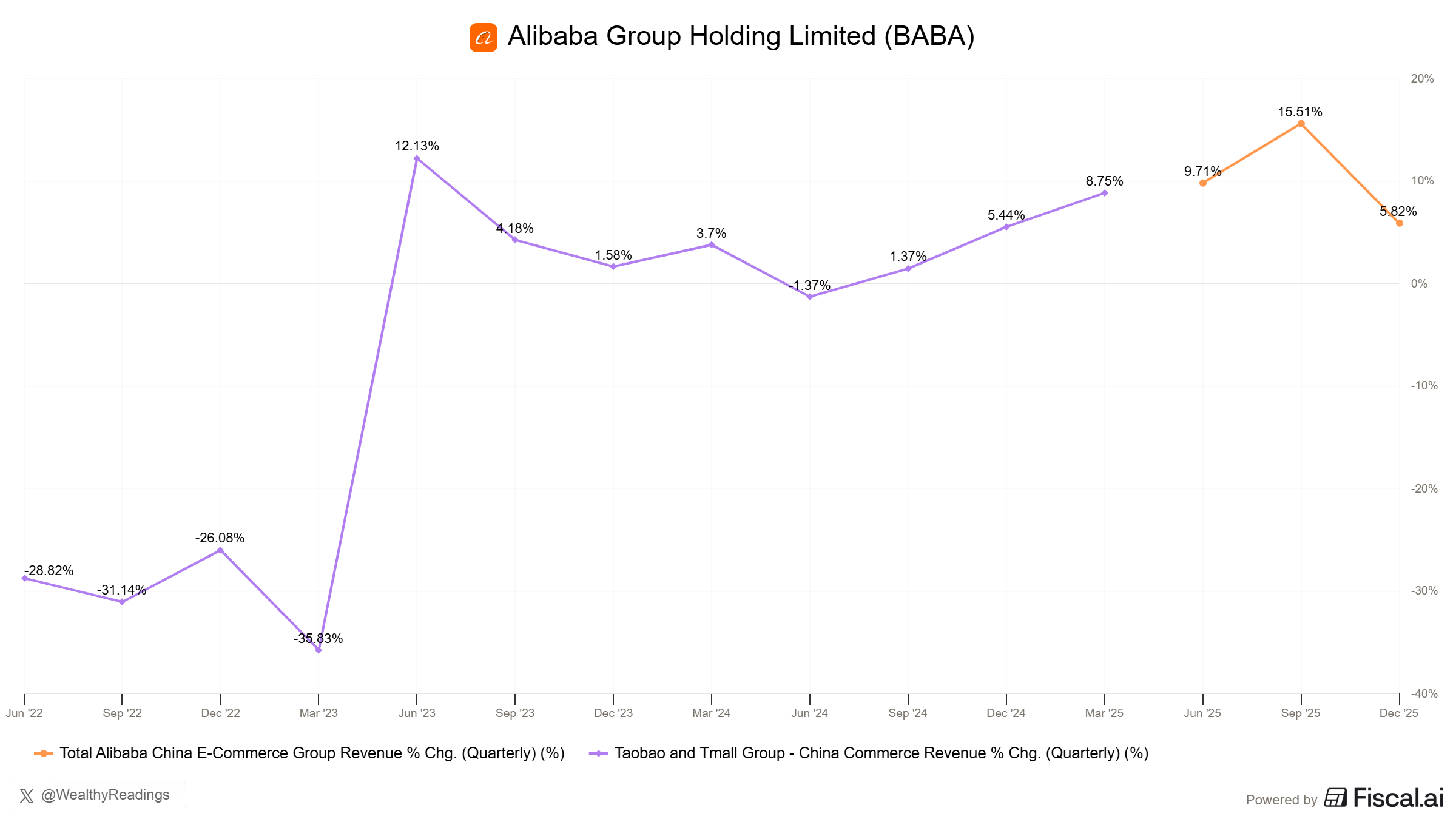 I believe the market is fine with their cloud situation and even this accountability trick. We’ve seen it in the west: you need to spend to grow and Alibaba has a large opportunity ahead plus very stable finances which allow spending. The issue is about spending on an e-commerce platform without much ROI as their quick commerce, which “only” is growing 20%+ is not generating much cash…
