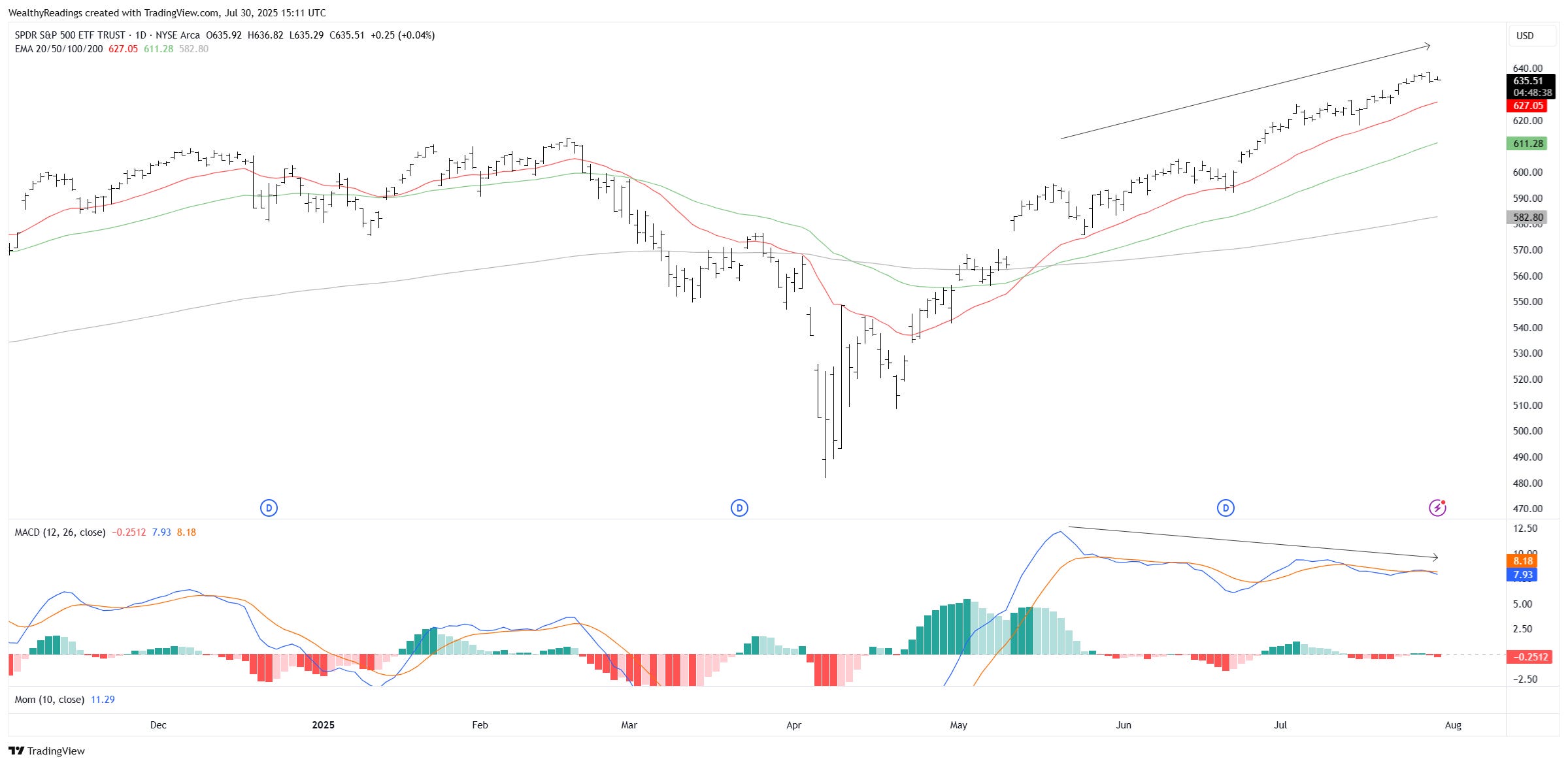 Momentum is a measure of returns acceleration and can diverge, giving indications on a trend strength. We have bearish divergences when the stock price goes higher while momentum declines, as shared on the screenshot below - which is the daily chart of the S&P500.