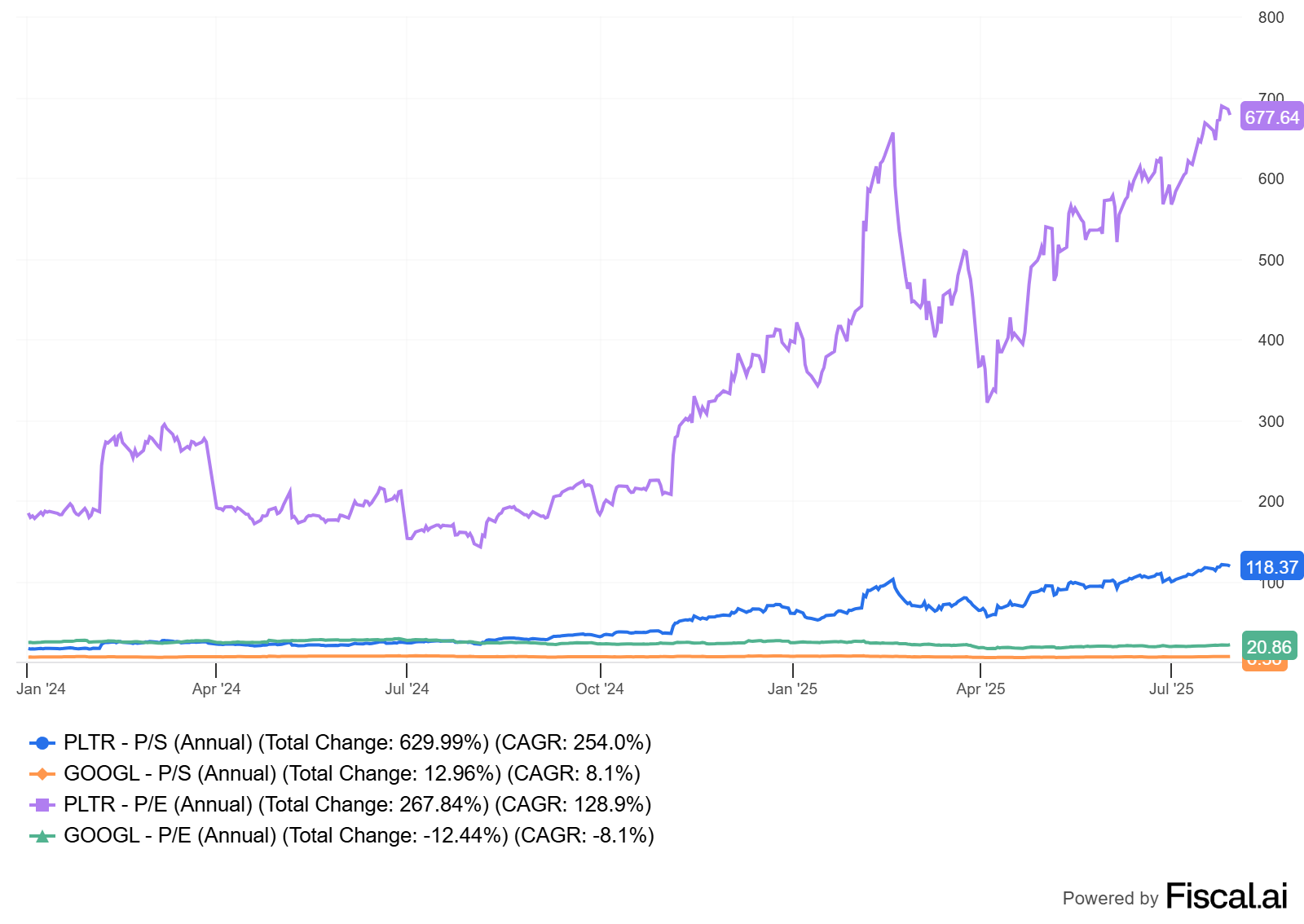It rewarded it to the point where Palantir trades at 125x sales and 680x earnings. I included Google on the screenshot so you can see the difference - while Google is arguably not less transformative & generates many times Palantir’s cash.