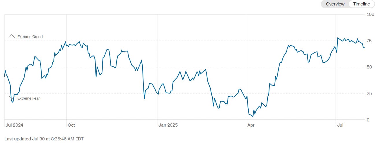 The fear & greed indicator is also a good tool. The markets can stay long in greed, but extreme greed is usually not sustained more than a few days & losing it is also usually followed by some weakness.