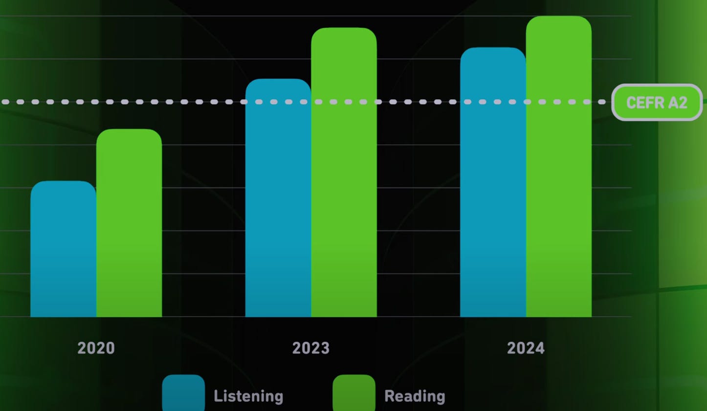 Our research team has run dozens of studies that prove that people actually learn on Duolingo. Let me tell you about one study that we did that we repeated across different years. This study we run-in 2020, 2023, and 2024. And here's what we did. We took people who didn't know any of the language that they were learning. They learned on Duolingo and only used Duolingo. And when they got to a certain point in the course, this is the point where you have Duolingo score 60. At that point, we tested them to see how well they listened and they read. And then these are the results. As you can see, over time, Duolingo's actually getting better. The people that we tested the in 2023 did better than the people that we tested in 2020. And the people that we tested in 2024 did better than the people that we tested in 2023. So Duolingo's getting better over time at teaching. Also, starting in 2023, the people who reach score level 60 actually have a CEFR level of a two. Meaning, they really are learning what we expect them to learn and we're very proud of this.