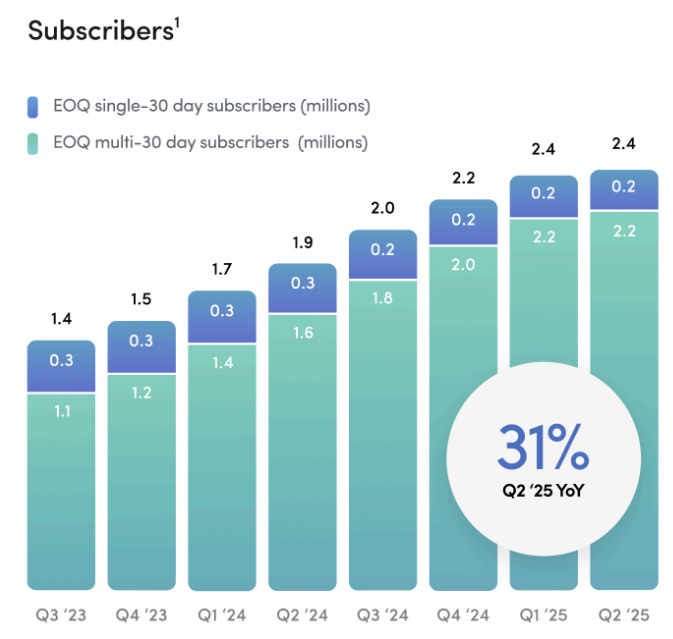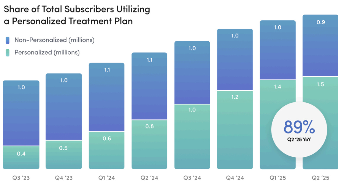 Subscribers increased 73,000 quarter over quarter to over 2,400,000, reflecting a year over year growth rate of 31%. We see continued robust subscriber growth across our dermatology, oral weight loss, and daily sexual health offerings that all sustain year over year subscriber growth rates above 55% in the second quarter.