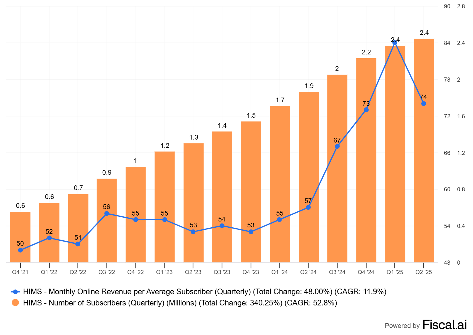 In brief, user base is healthy & I wouldn’t be too concerned on acquisition, but I am concerned on average revenue per subscriber & conversion/retention rates. This would yield a lower growth as users spend less on the platform and we don’t have any short term growth sources while comps will be harder in H2-25 & FY26. New products & geographies will take time & investments to develop & yield returns - assuming Hims succeeds which isn’t a given, hurting margins in the process.
