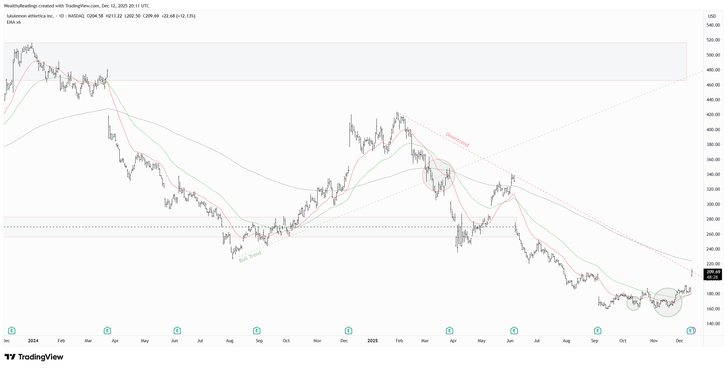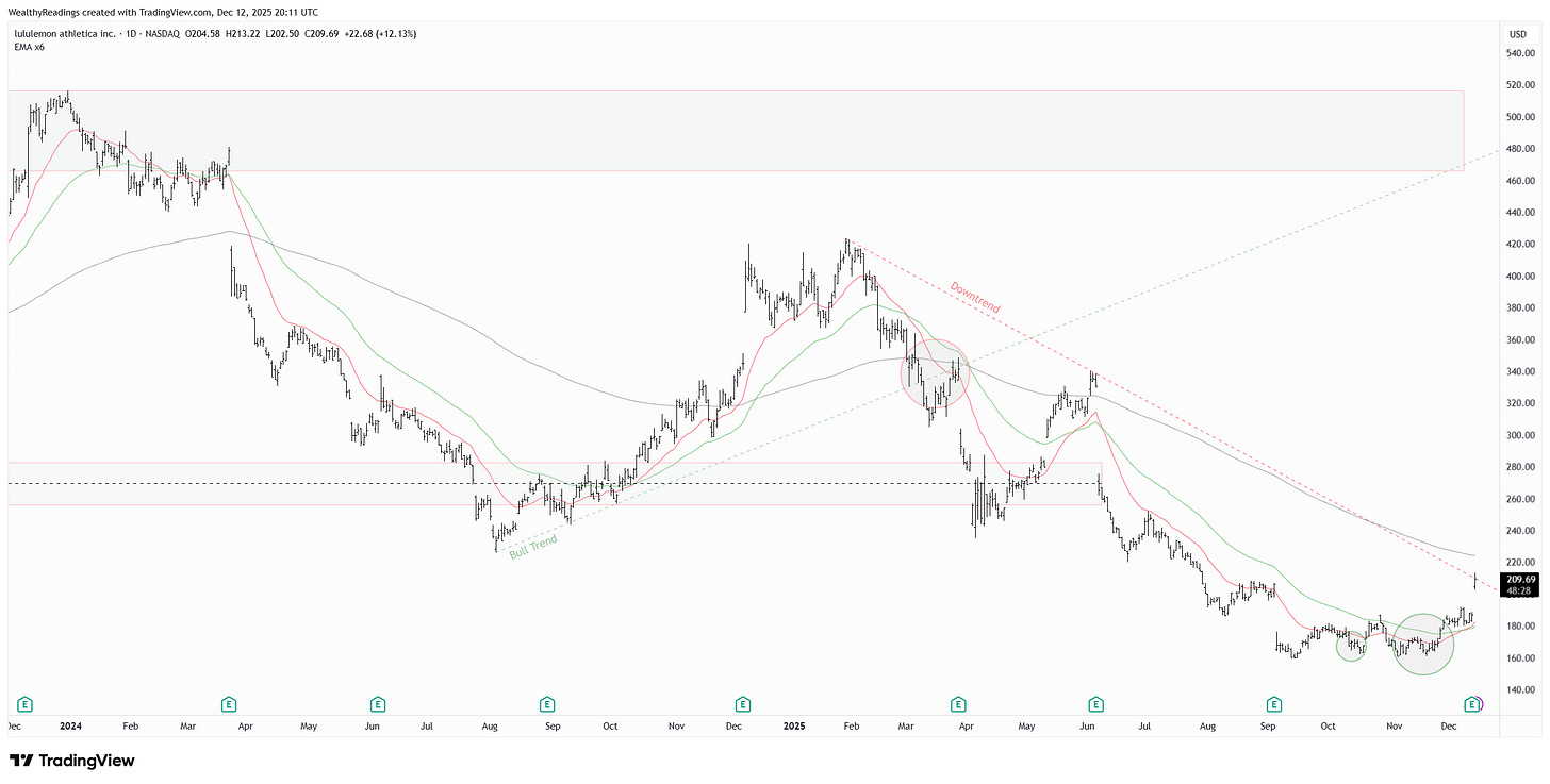 That said, stocks don’t usually have V‑shaped recoveries so even if Lulu is up 10%+ today, don’t feel like you missed the train. I’d put it in the same category as Adobe: downtrend might be over, now comes consolidation.
