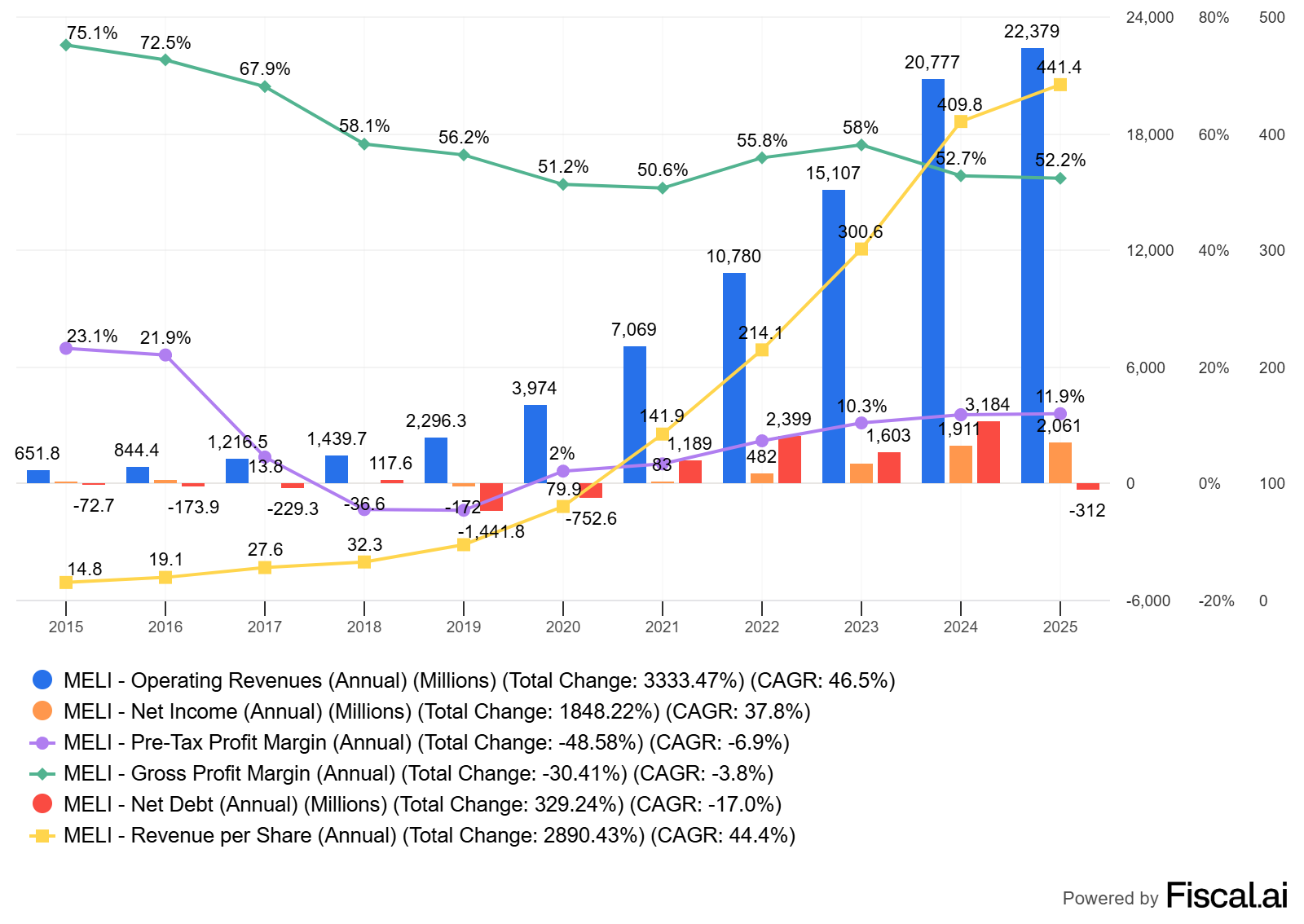 The second half of the decade is a story of expansion with declining gross margins as they grew their financial business and expanding net margins as they also optimized gloablly. To finally reach today's situation: a very stable company generating tons of cash, with a strong balance sheet, strong fundamentals, focused on user & merchants acquisition & retention, and eventually some returned value to shareholders in the future - none for now as the focus was on reinvesting & growing.
