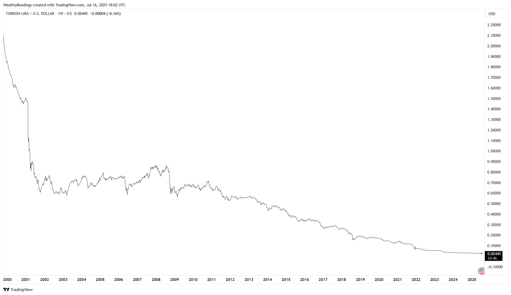 For a practical example, here is the value of the Turkish Lira compared to the Dollar.
