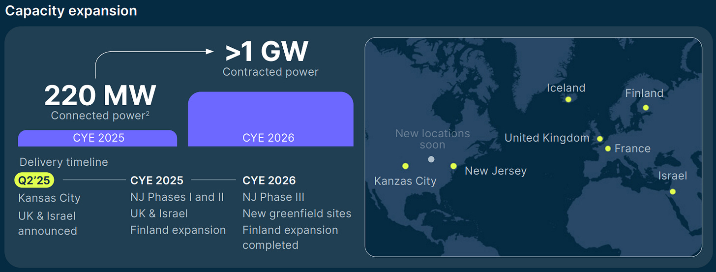 By the end of this year, we expect to have secured 220 megawatts of connected power that is either active or ready for GPU deployment. And this expansion includes our data centers in New Jersey and Finland. In addition, we have nearly closed on two substantial new greenfield sites in The United States. And overall, we're in the process of securing more than one gigawatt of power by the 2026 to capture industry growth next year.