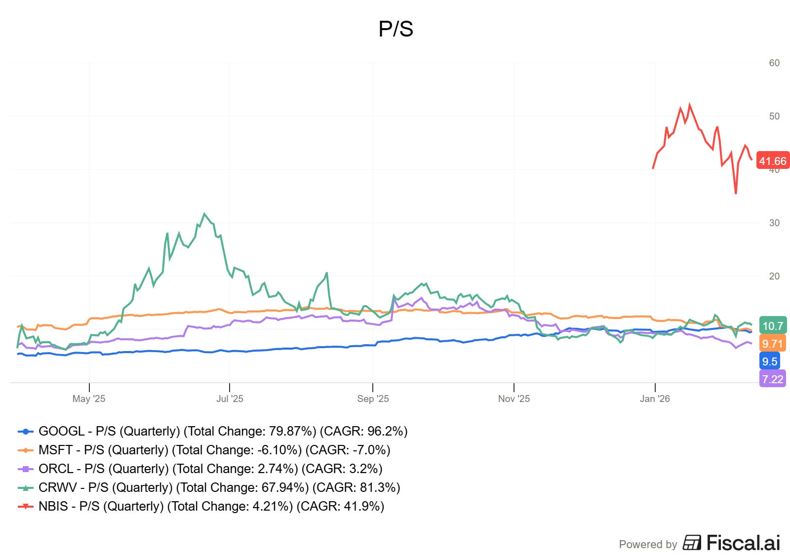 Although yes, growth is incomparable as Nebius is guiding ~500% revenue growth which would push its P/S down to ~10 by end of year 2026, matching others. To that we need to add execution risk and demand concerns by then, making Nebius the highest valuation and risk of them - except maybe for CoreWeave.