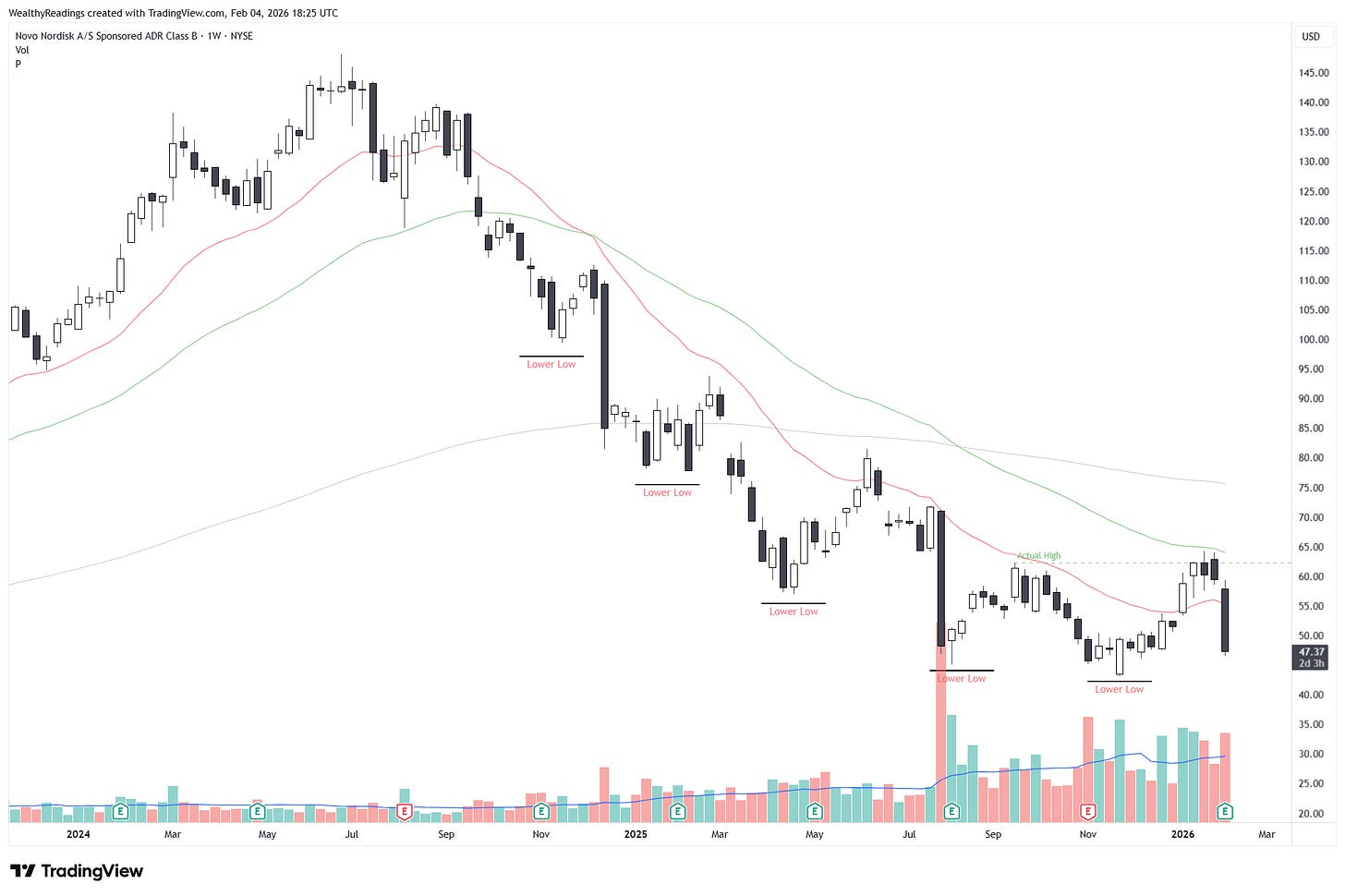 My thesis is broken so I am out. That being said, I’ll keep Novo on my watchlist as the first half of 2026 is one thing but the prediction for their GLP-1 pill demand is almost impossible to get right, so that terrible guidance might be reviewed before H2-26, with maybe a better chart, more demand, a clear range… Valuation is very low at 4x sales but the market taught us again and again that cheap can get cheaper.