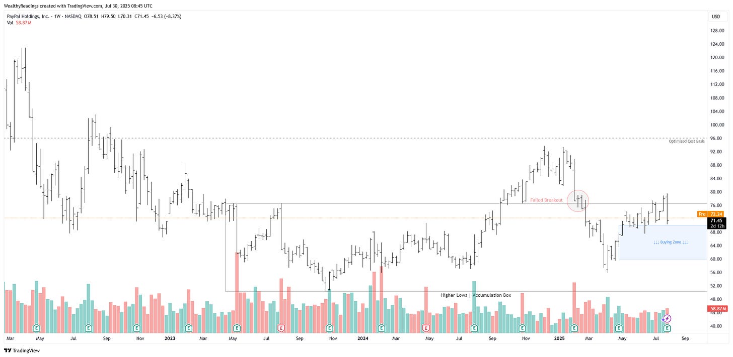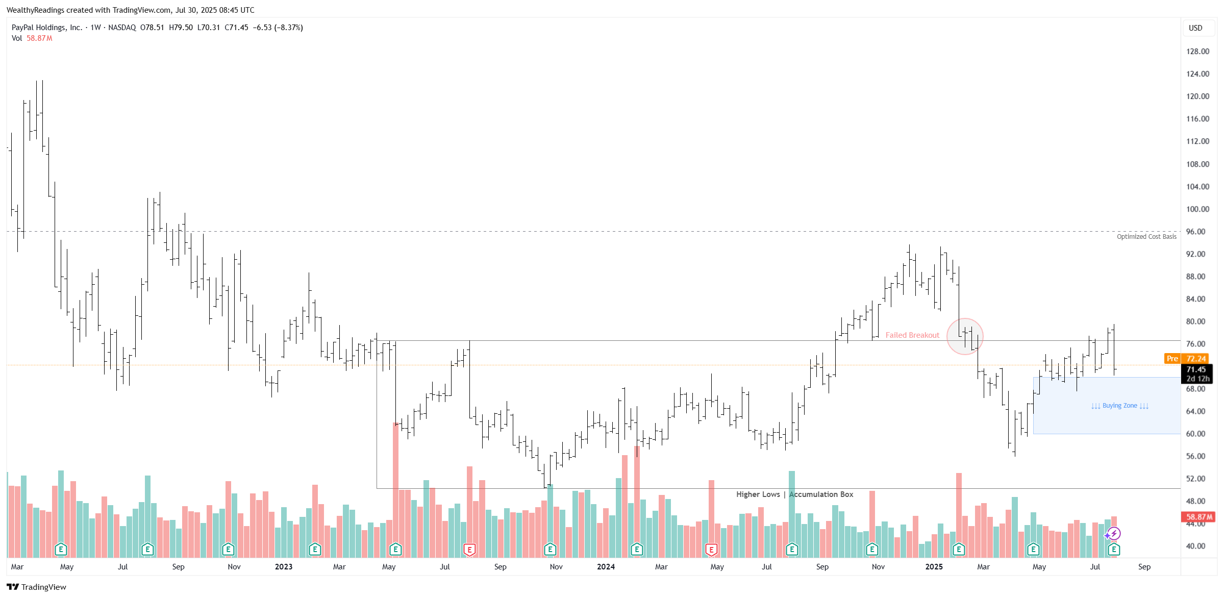 This is an accumulation phase, not an uptrend. I personally accumulate as I believe in the turnaround story as PayPal shifts great services and is fixing the issues with its core business, and data starts to show it, just not financially - yet.