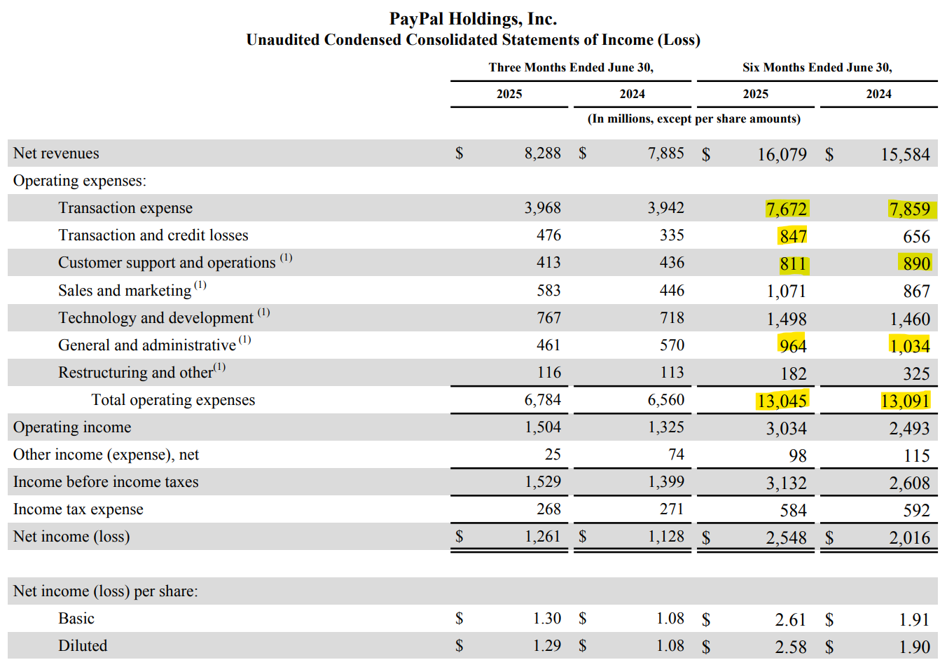 Revenues grew 3.1% YoY H1-25 but it comes with lower expenses - as management cut on some of Braintree’s unprofitable growth, and supports and G&A are down YoY. This screams better efficiency within the company, and sure marketing spending is higher but this isn’t a bad thing as the brand needs it to share its new features, and there is also an uptick in losses which is part of the business & fluctuates.
