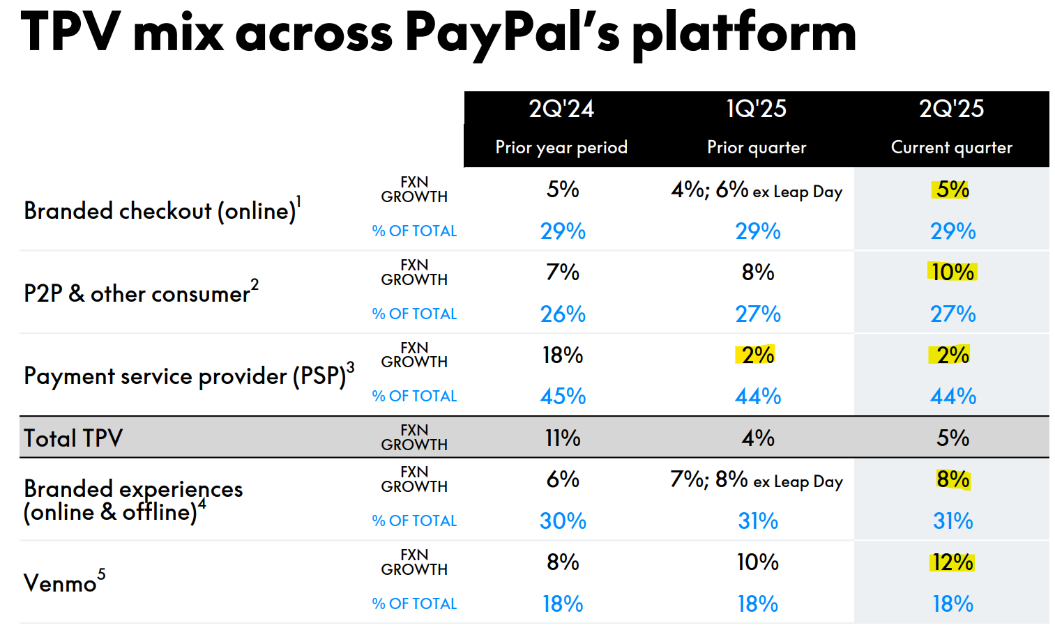 Transactions per active account ex PSP grew 4% as more people use PayPal and Venmo more often […] I'm proud that we drove 8% currency neutral growth in Branded Experiences TPV this quarter.