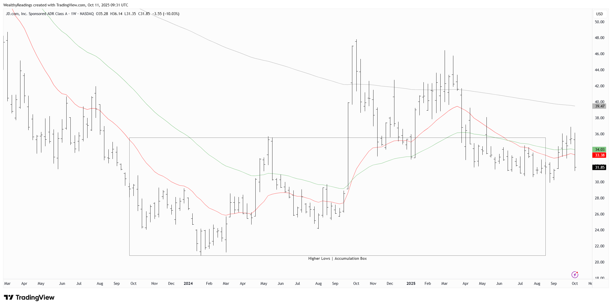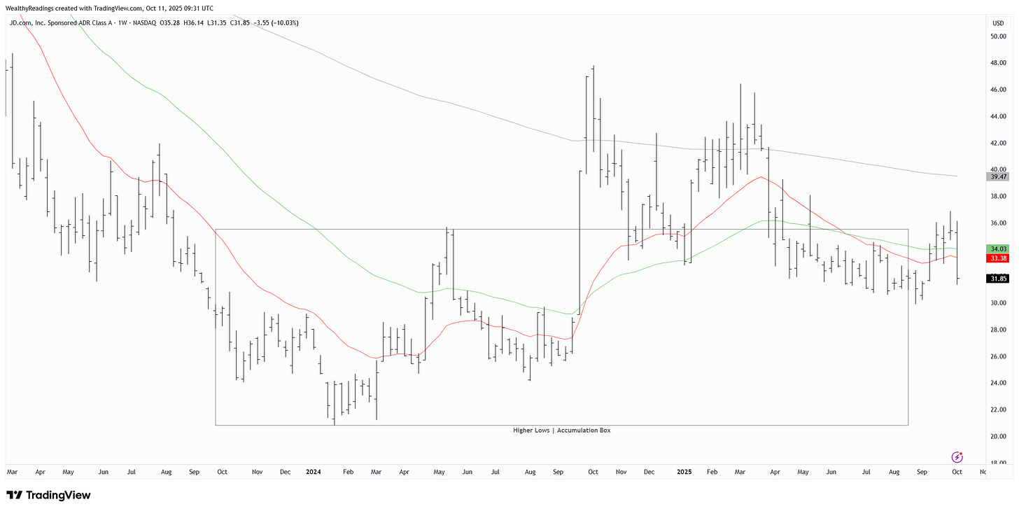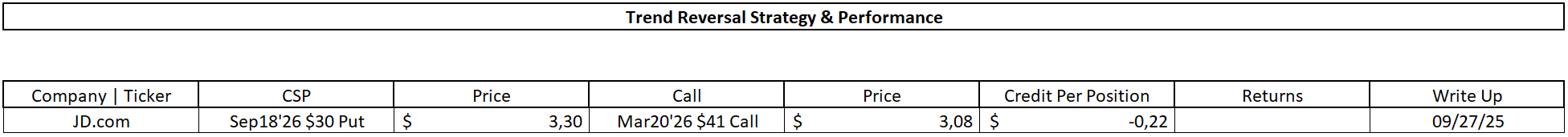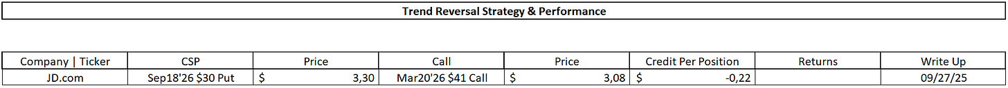 JD.com is a bit trickier, as the stock lost its daily 21 and 50, not a great look. The asset is more impacted by additional tariffs than Chinese tech. The trade expires mid-2026, and I remain confident for the puts, less for the calls, which I would sell if the situation worsens, but I was paid to buy them.