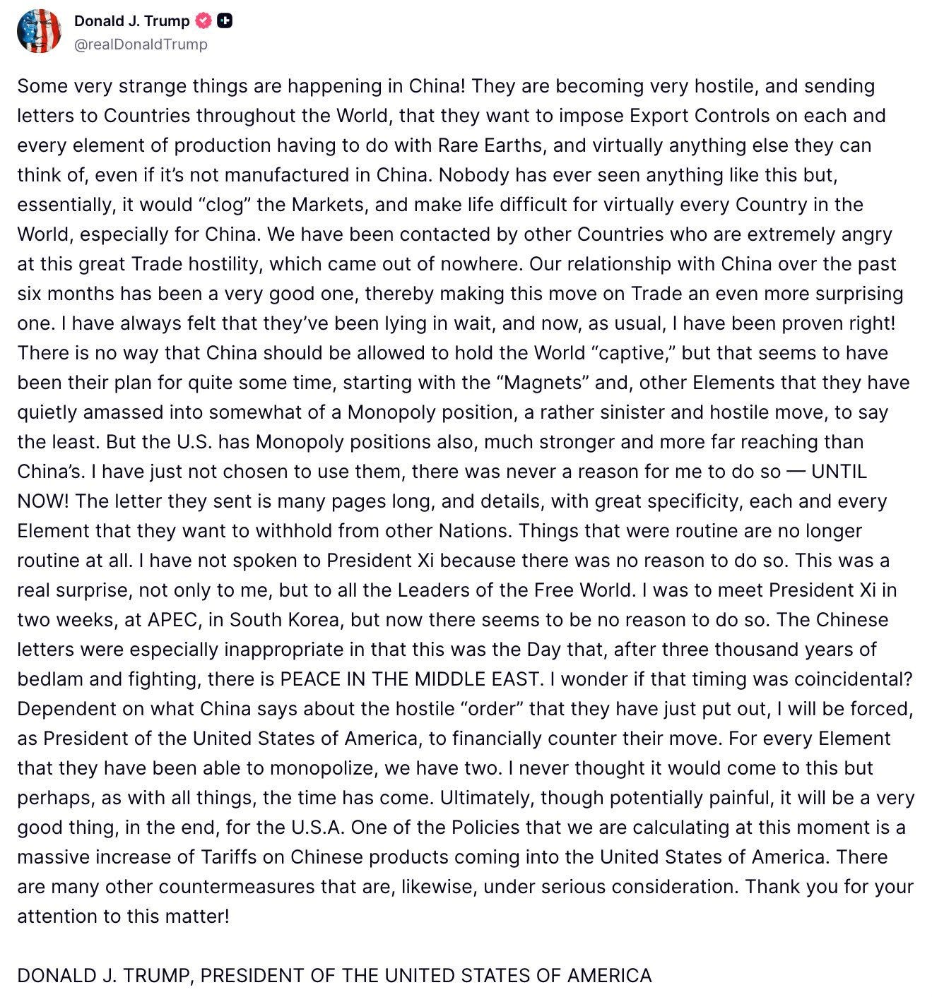 China’s threat to cut off rare earth exports is its golden card, many expected it back in April, but it didn’t happen. Why now? No idea, but Chinese moves are never irrational nor impulsive. They usually push only when they know they can win. Trump answered by a new 100% additive tariffs on Chinese goods but China already showed it wasn’t impressed by those while the GPU export controls are already in place.