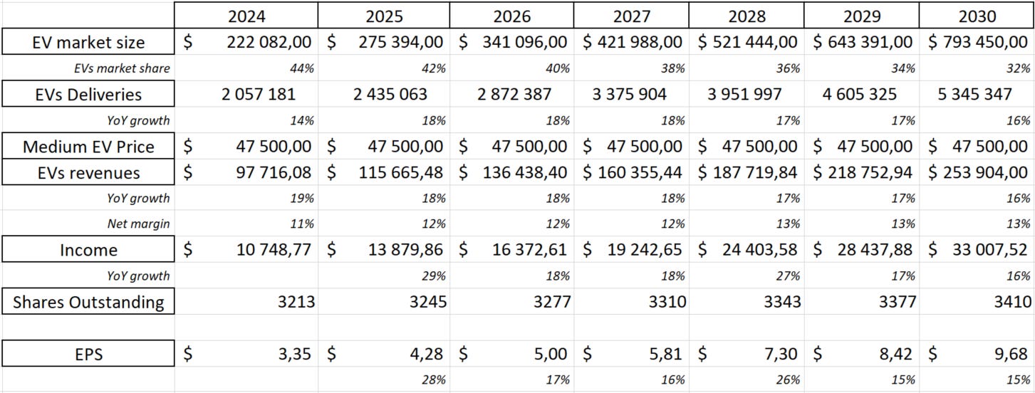 2024 will surely be more challenging than my projections. But selling 5 million cars by 2030 at a 13% margin doesn't seem overly optimistic - it's less than half of what Toyota sold in 2023.