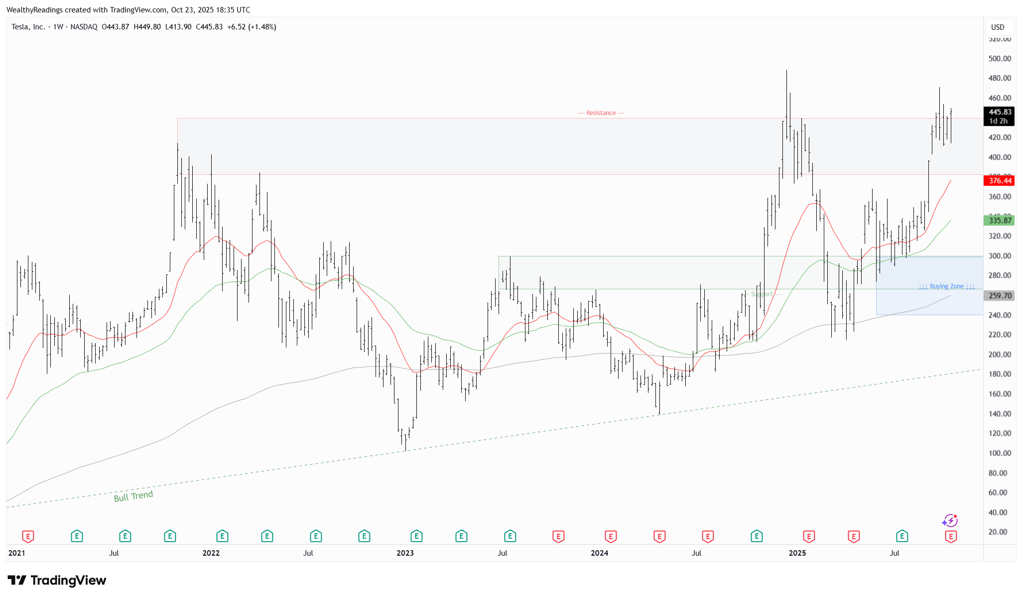 Reminder that Elon purchased shares on the open market at $350, which should act as a psychological price for many in the future. I would accumulate around that price given this quarter’s data and the weekly 50 there. Until then, I am happy to hold.