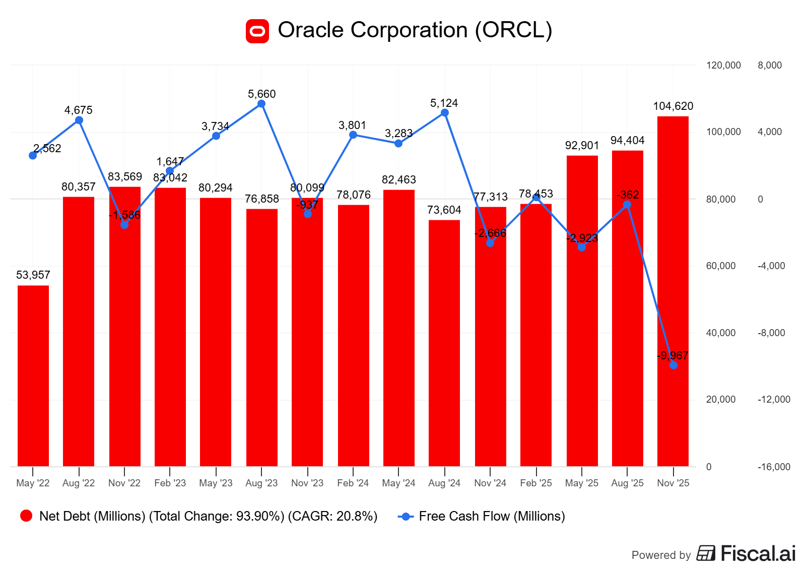 With reason, as Oracle’s aggression translates into a $104B net debt with negative Free Cash Flow and the expectation to raise even more debt short term. It is normal that lenders ask for more yield in this kind of situation as risk is real.