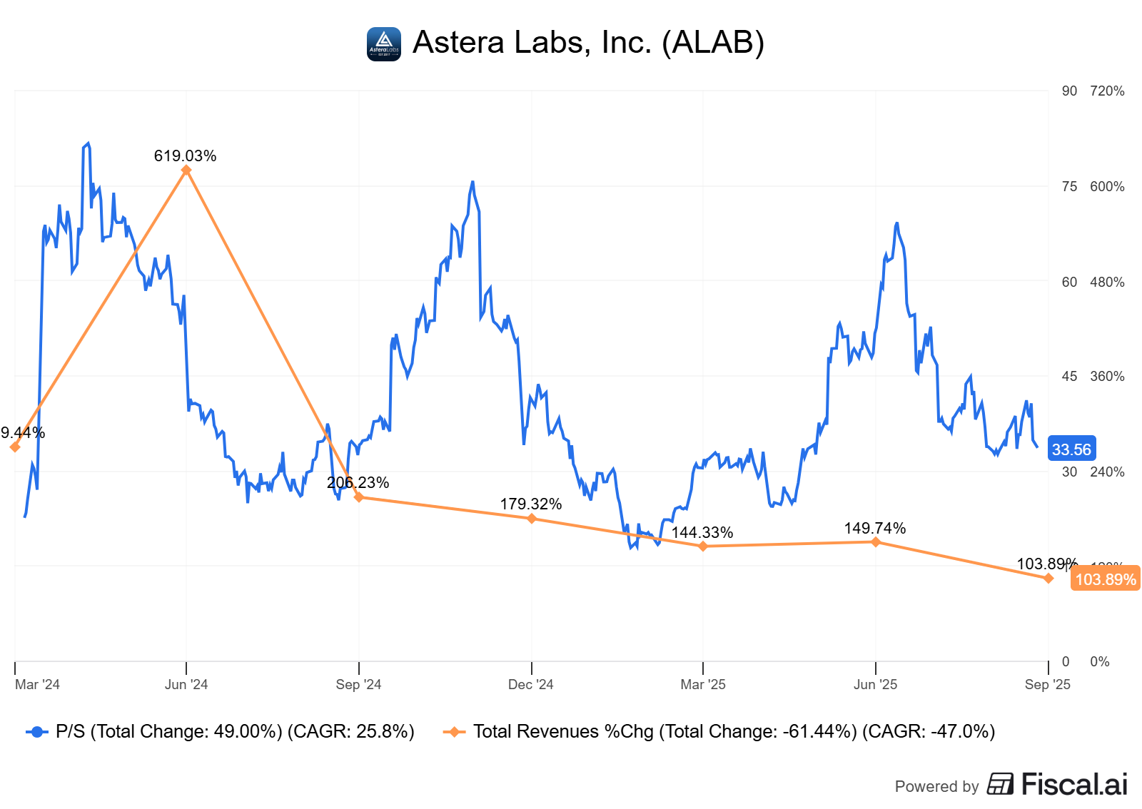 From a market point of view, it would be an exaggeration to call AsteraLabs cheap - it isn’t. It’s a great stock, properly priced for stable execution. The stock trades at 33.5x sales at the time of writing, but is expected to grow over 50% next year so less than 20x F.P/S. Important to say its key scale-up hardware are expected to ramp up early 2026, which makes future revenues estimates hard to anticipate as they could also accelerate due to those products and the flywheel.