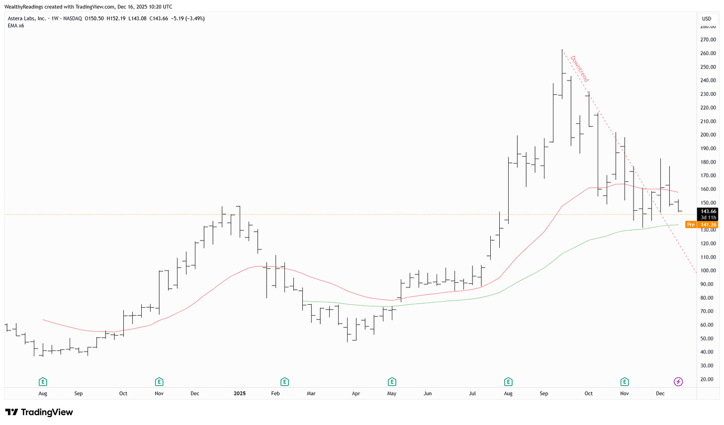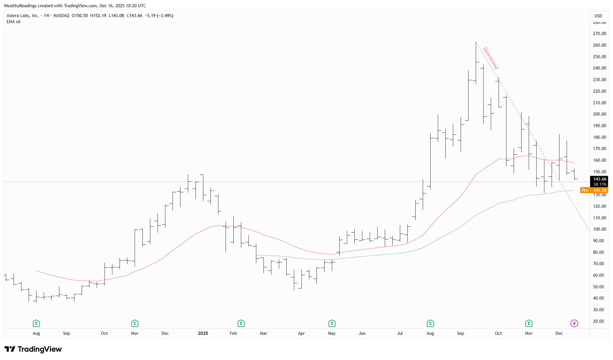 In terms of price action, the market has been violent lately, selling off many smaller-cap stocks out of fear that large commitments will disappear. However, AsteraLabs is holding above its weekly 50 and is ranging near its earlier ATH. Hopefully, the ATH will continue to act as support, because breaking lower could open the door to lots of pain, for longer. And that’s a tough spot to be in when holding a stock.