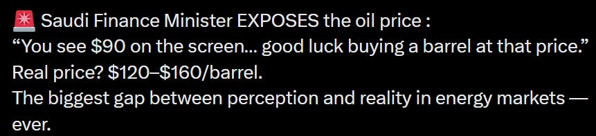 Oil, first. I went through it in length on my last monthly report, so I’d advise you to read it. The Strait of Hormuz has been closed for two months; impact on economies is real, increasing exponentially each passing day. What was a slower production or a reserve depletion which could be managed is either becoming a shutdown or a forced purchase of oil at quasi double usual prices.
