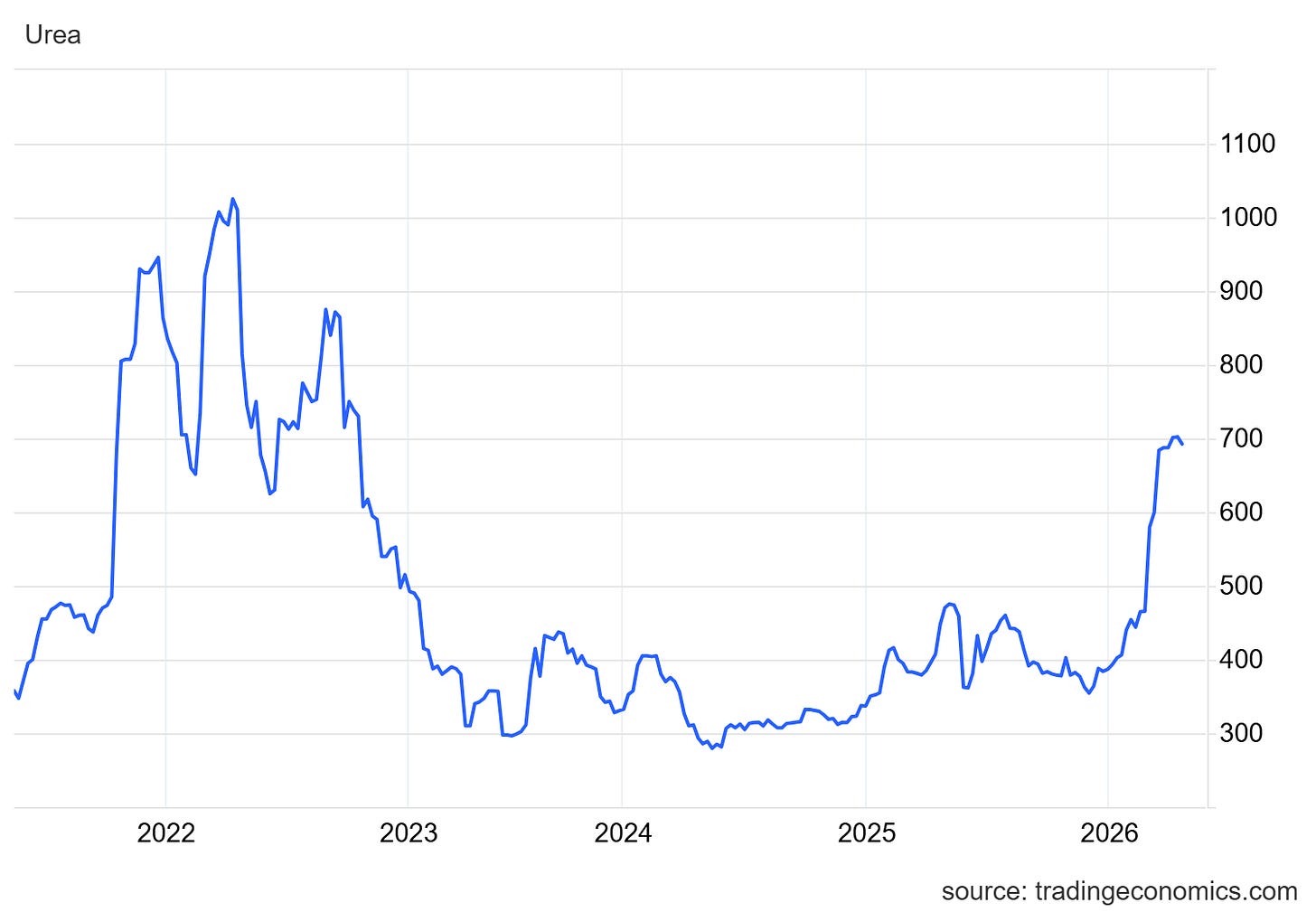 But there is more to it. As oil prices affect virtually everything, directly or indirectly, there is another key sector which relies on it: agriculture. Not just running tractors on the fields but also manufacturing chemicals; one of them used for almost any kind of agricultural production: fertilizers. Guess what is happening to the commodity price?