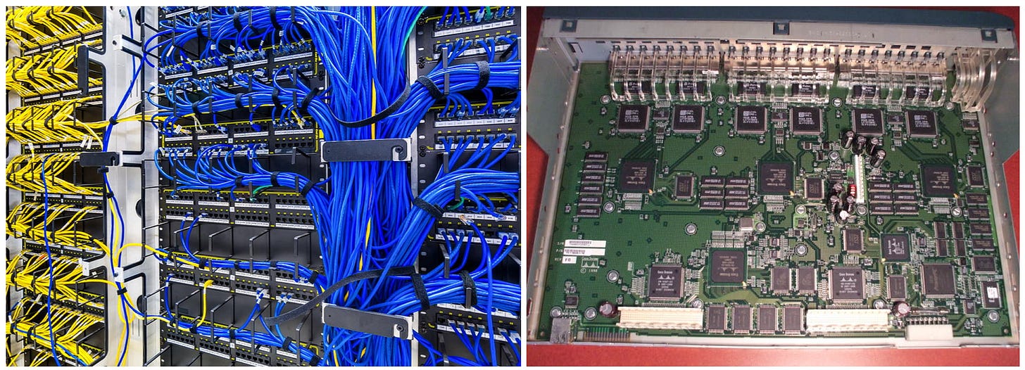 Datacenters are the interconnexion of thousands of hardware, each with its own specialty; a hardware is the interconnexion of hundreds of semiconductors. Data transits through them via electrical or optical “cables” between them in the datacenter or conductive metals - copper as the cheapest conductor to scale, within the hardware.
