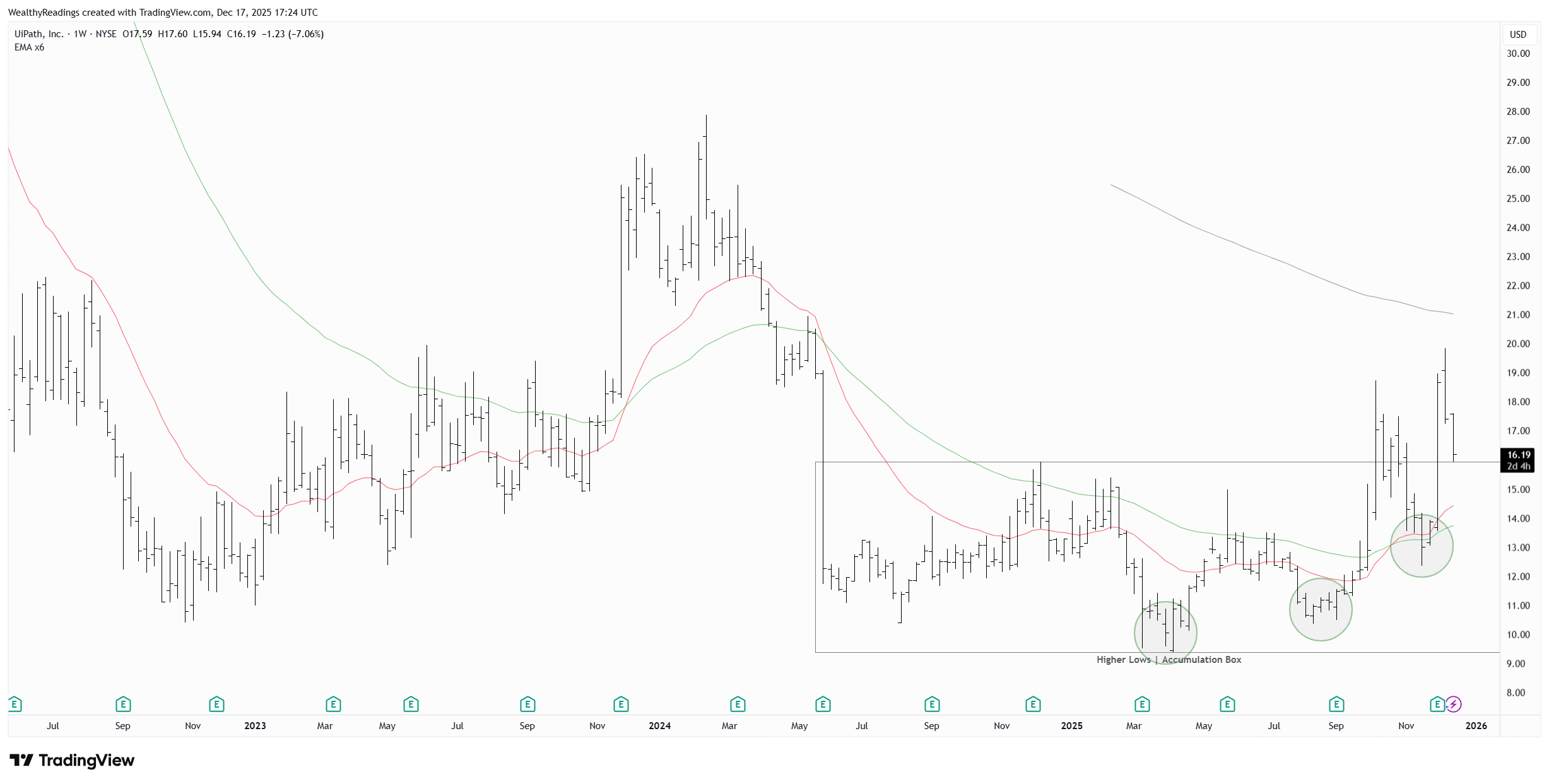 Perfect entry would be around ~$14 on the weekly averages, and that could happen. I already bought because even at $16 this looks like an opportunity - assuming the acceleration thesis holds.