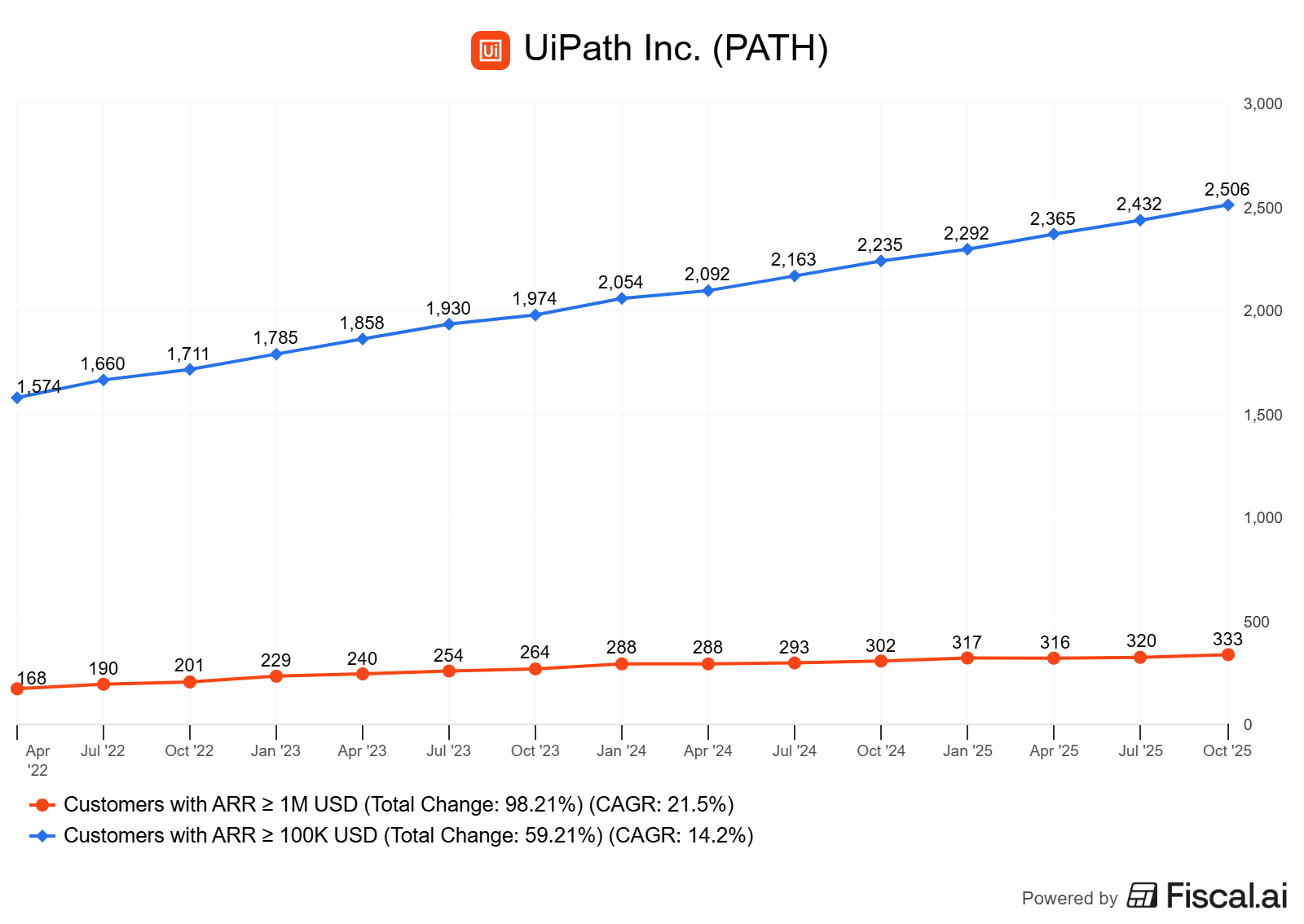 More positives, there’s no revenue concentration. UIPath didn’t disclose any client accounting for more than 10% of revenues - which they’d be required to if it were true. They serve 10,860 customers as of last quarter.