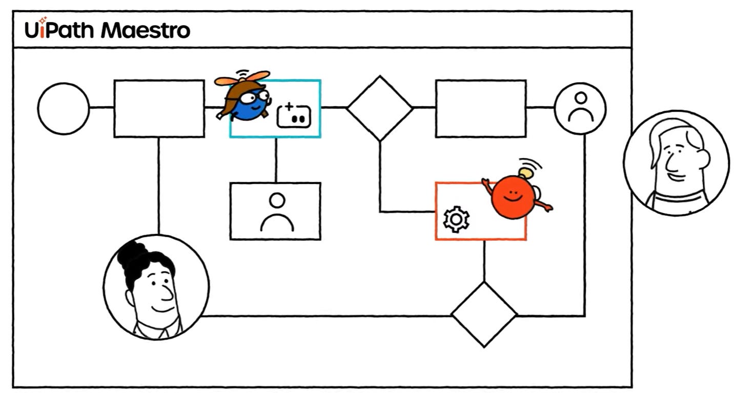 Maestro is the star. Its job is to organize the interaction between RPAs, agents and humans to build complex, multi-step models.