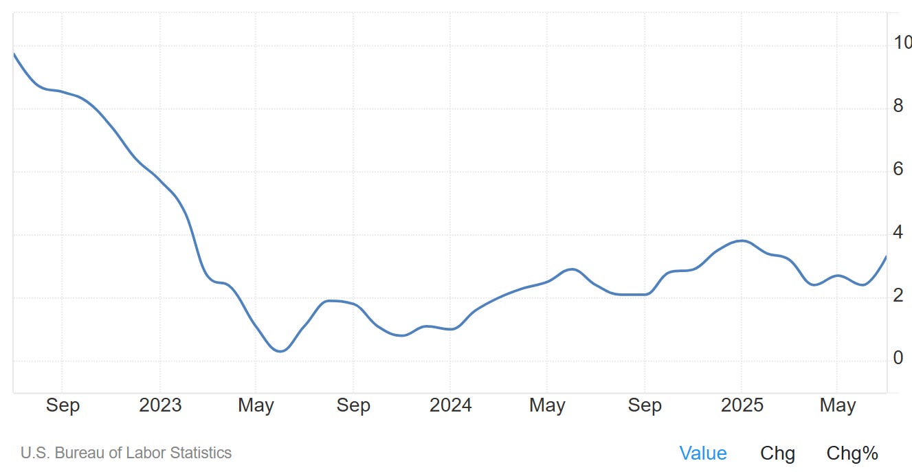This means that production prices are increasing, and this increase will either have to be passed to consumers or absorbed by U.S. companies, hence shrinking margins. An impossible situation which I talked about for months now as this was the only possible outcome of tariffs. It did not happen earlier because of the inventories built before April. We talked about this earlier as well.