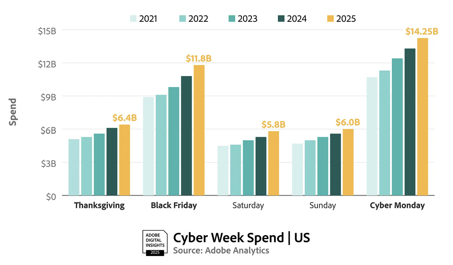 Adobe and other data providers confirmed the same. Cyber Week saw +7.7% YoY spending across sectors. Adobe also tracks where the traffic comes from, and of course, AI-driven click generation went wild, with social media being one of the strongest drivers of spending.