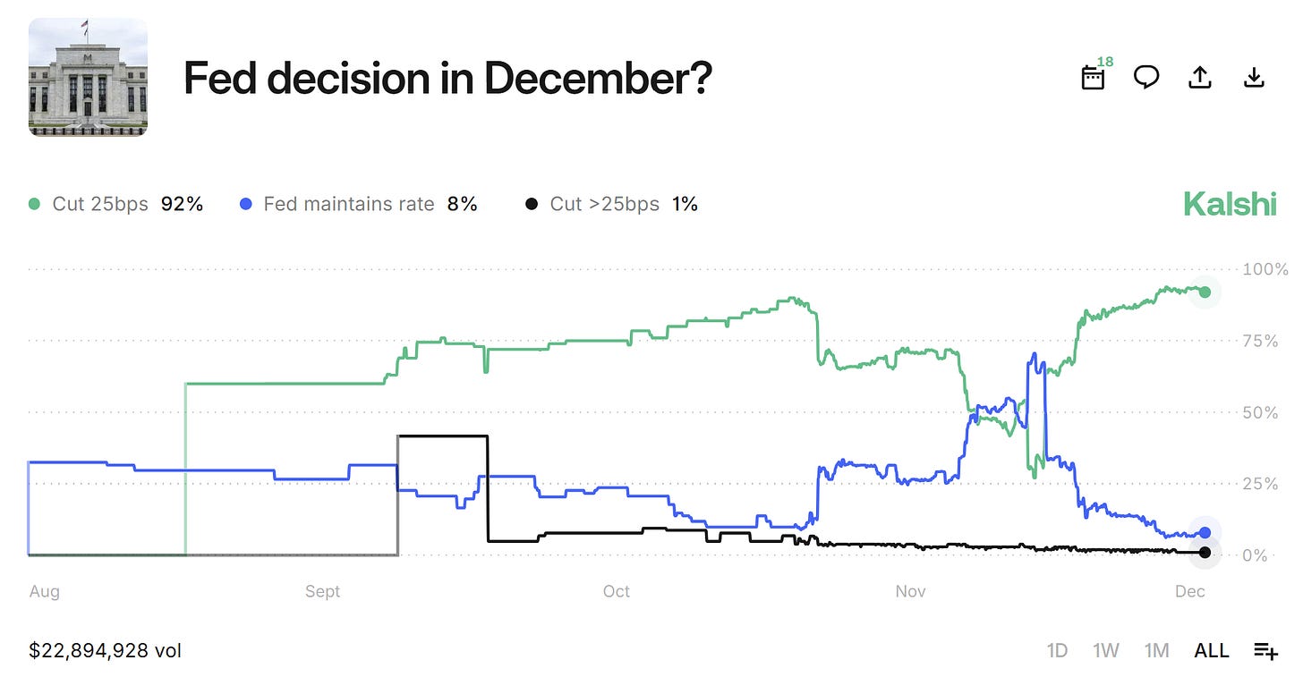 Two weeks ago, I wrote that I didn’t buy the narrative saying the FED wouldn’t cut rates because we lacked inflation/labor data due to the government shutdown. That take aged well and some of the buys made during that panic turned out to be great entries. But still, it’s too early to celebrate.