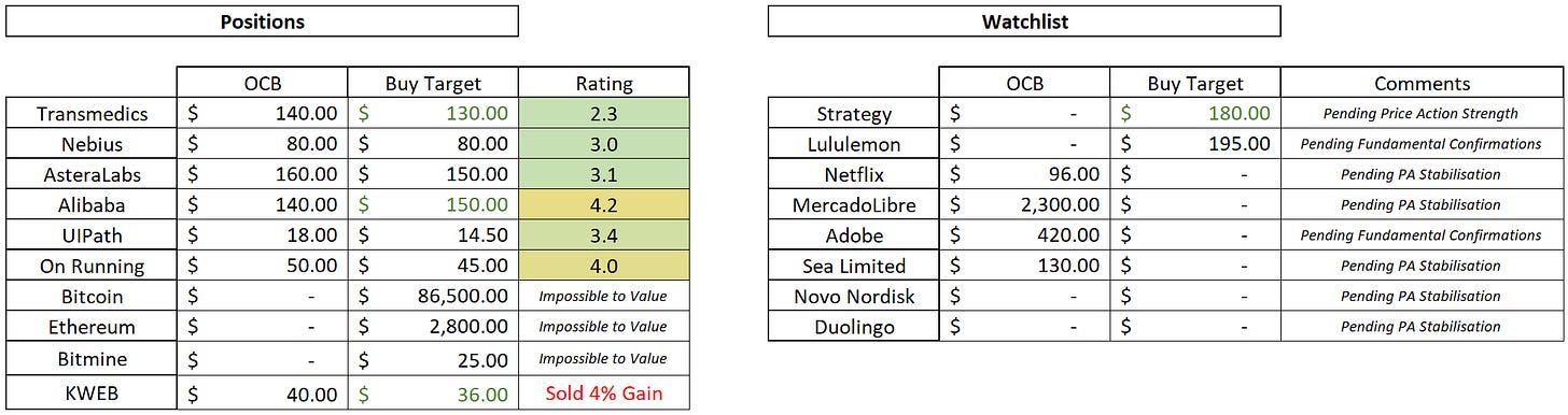 Nebius went to close its gap at $75, the best possible entry point I could have wished for - as shared in my last quarterly review. I’m not as excited as some on social media; we had a great Friday with positive news but I’m expecting some consolidation before the next leg up. Nebius doesn’t have his next higher low so we could easily retest $80 soon. I’ll be buying if we do as the value at this price is impossible to ignore if the AI demand remains that strong.