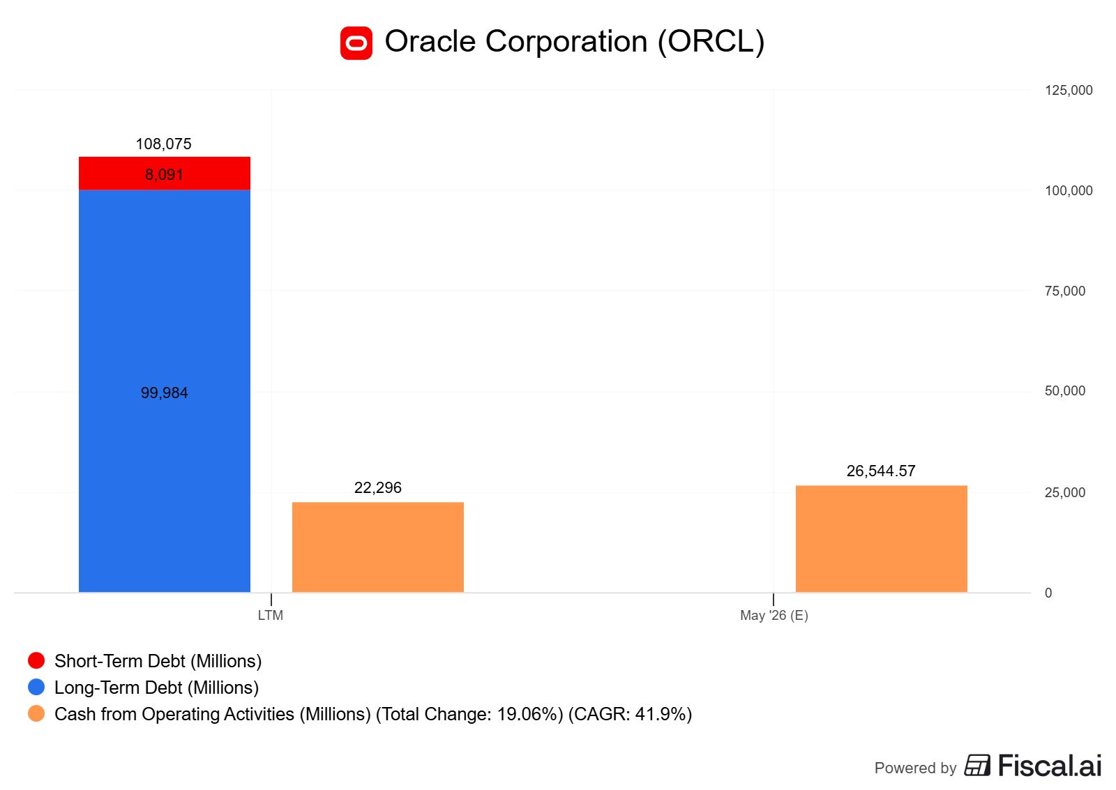 Over the last twelve months, Oracle generated about $22.3B in cash. They’re sitting on $110B in debt, with roughly $25B due in the next three years. They estimate cash generation will jump 19% YoY to ~$26.5B by the end of their fiscal year in May.