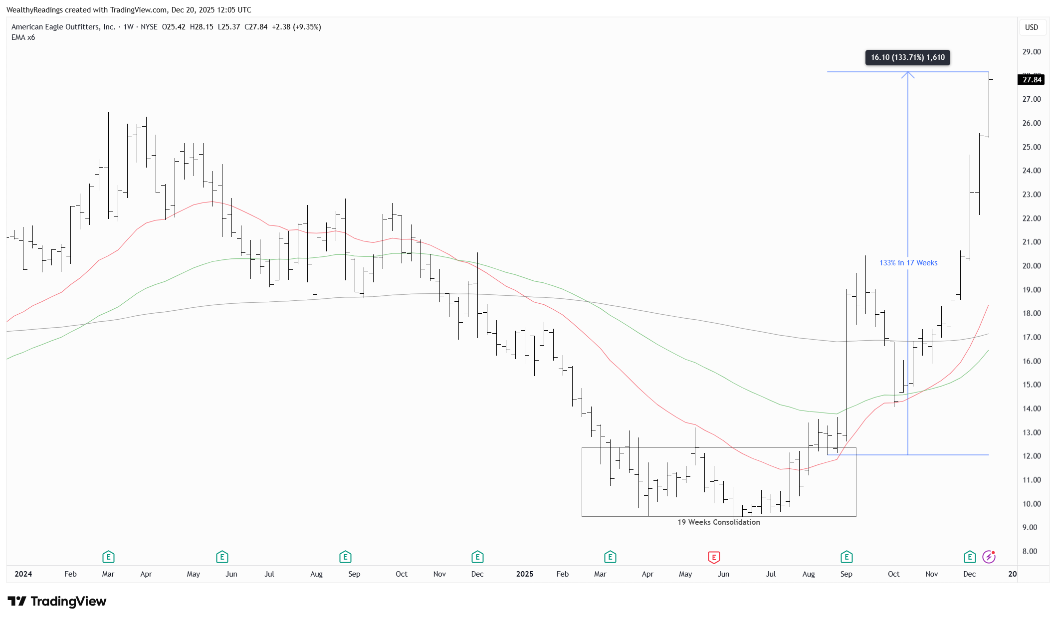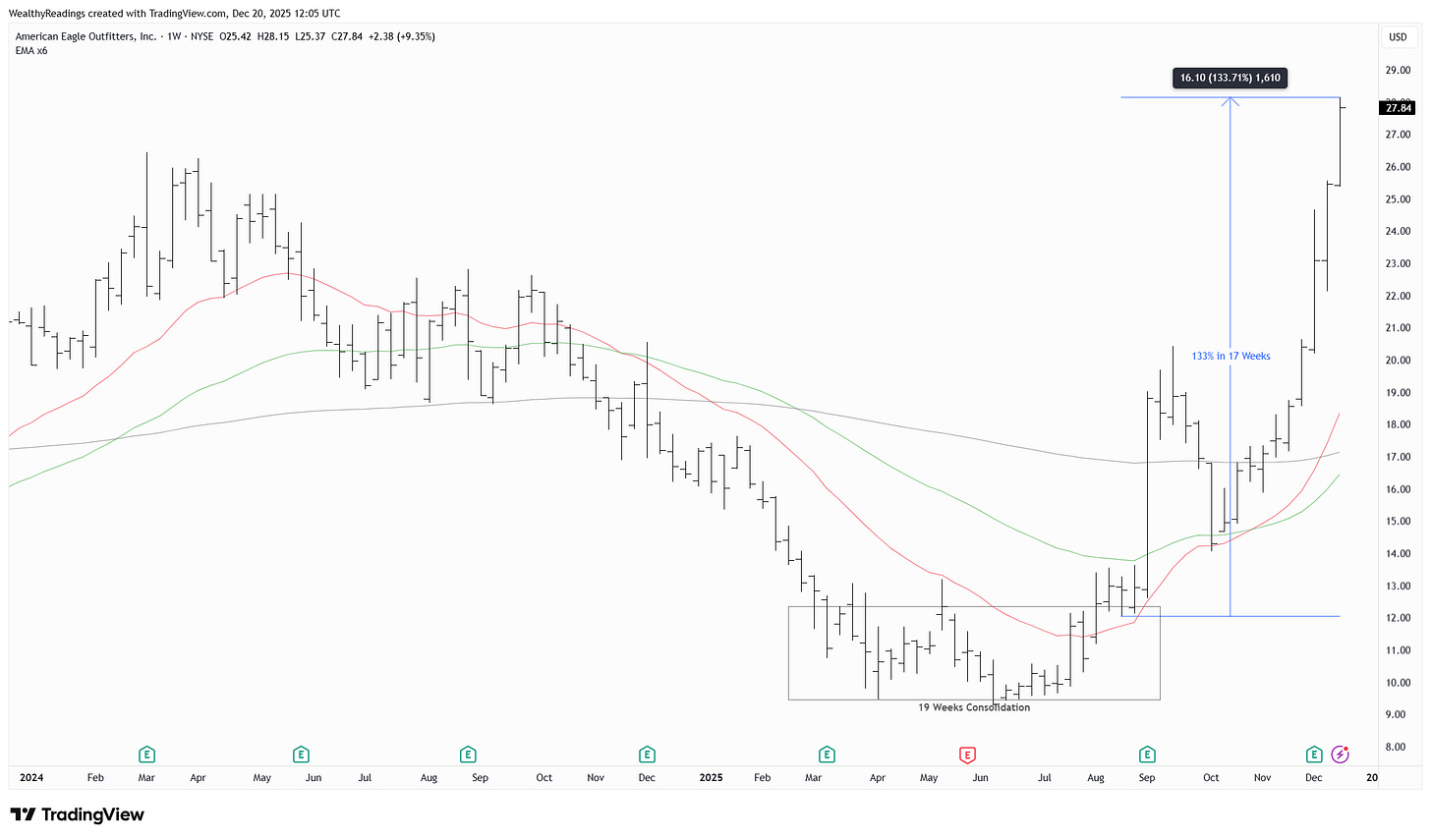 Lululemon showed really strong price action after its quarter. I personally want to see proof of growing demand in the U.S. before starting a position, but for those willing to take the risk, the breakout retest at $195 is a perfect entry. I’m staying patient for consolidation, but we saw with American Eagle - which is up 133% in 17 weeks after a similar double-bottom retest, that patience isn't always rewarded.