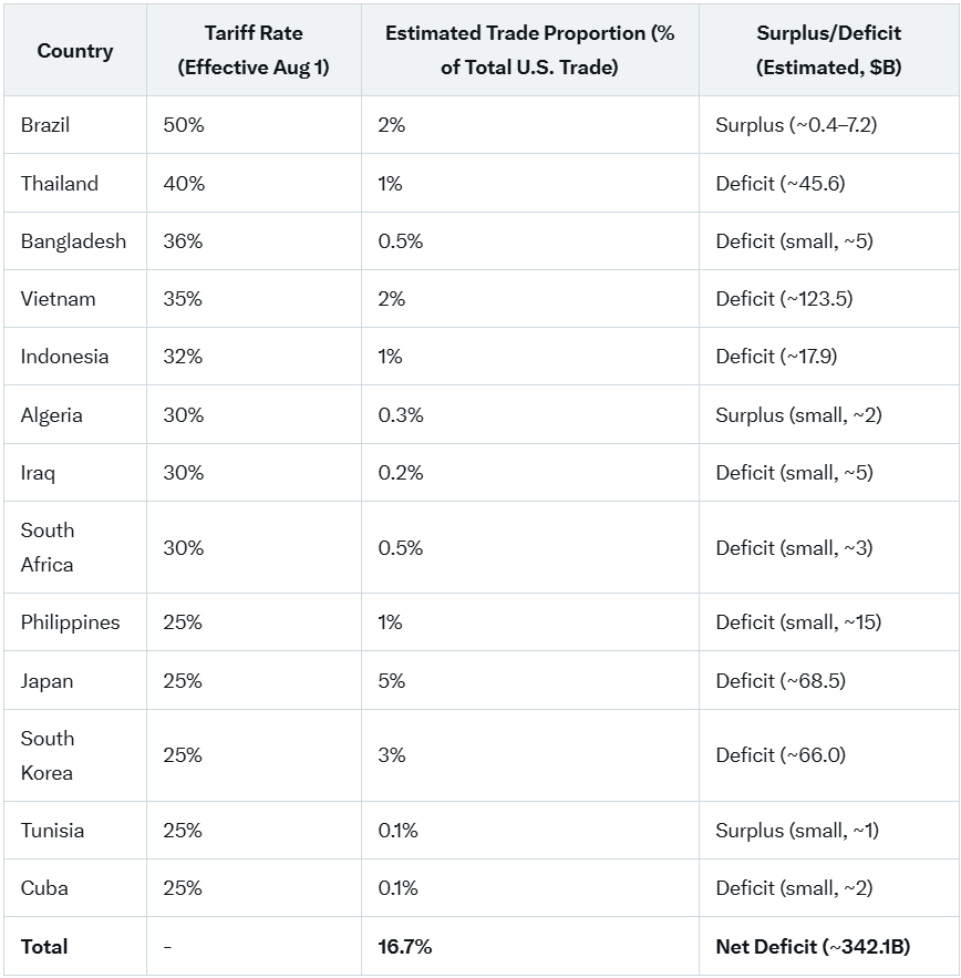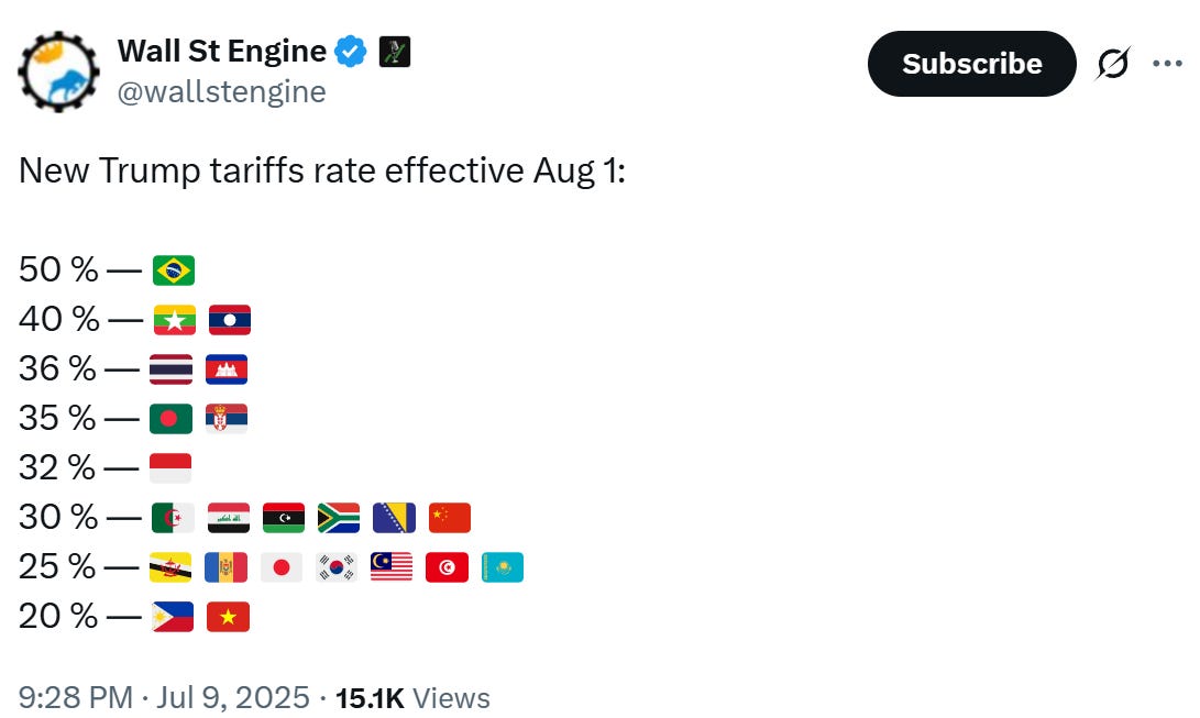 But Trump is not stopping & threatens more tariffs on other countries starting on August. We need to add to this list 30% on Europe announced saturday.