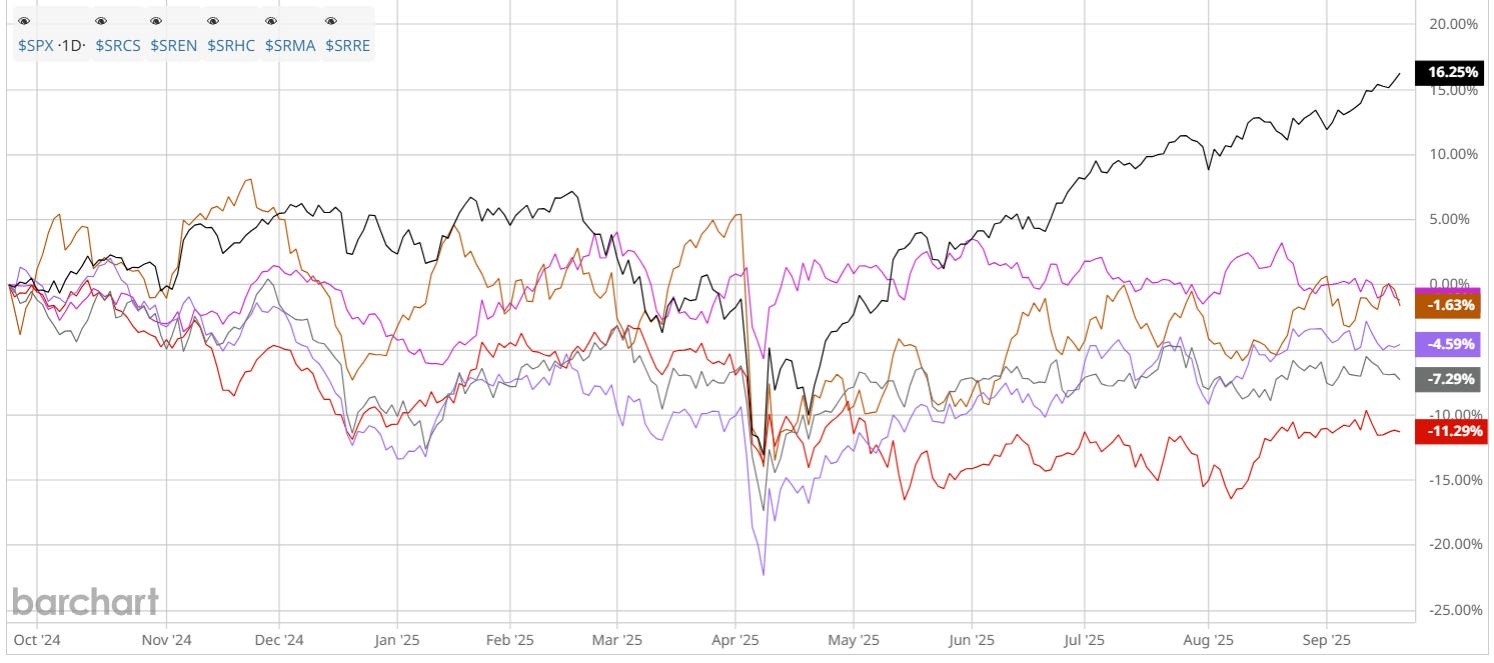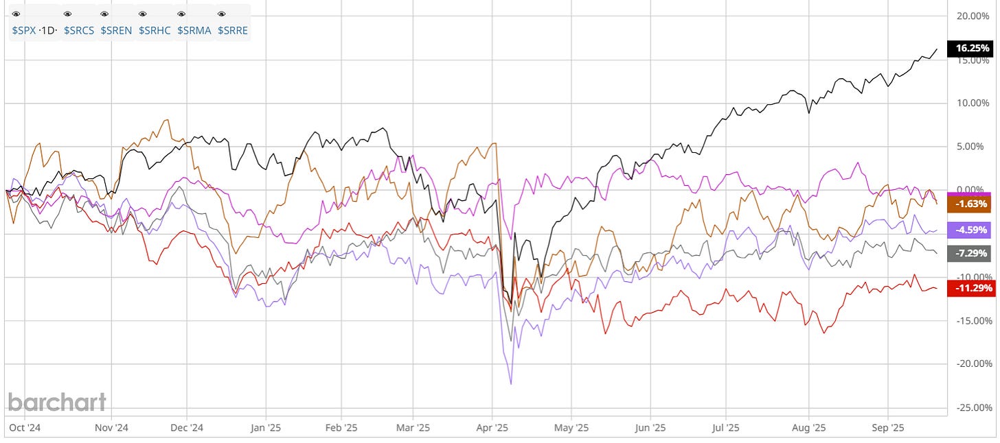 Today, 5 sectors are underperforming the S&P with negative yearly results: Healthcare, Real Estate, Materials, Energy, and Consumer Staples. And we have two paths forward short term, in terms of investing: