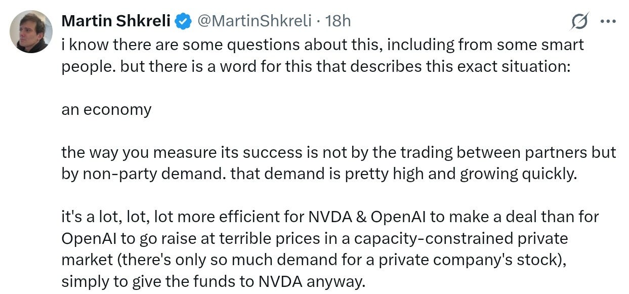 Nvidia provides hardware, Oracle uses this hardware to provide compute and OpenAI uses this compute to provide a final service & generate income in users’ subscriptions. They provide different goods/services but rely on each other so what Martin explains is that instead of raising capital from the market, they invest in each others and rely on their common success to generate value - equity in that case.
